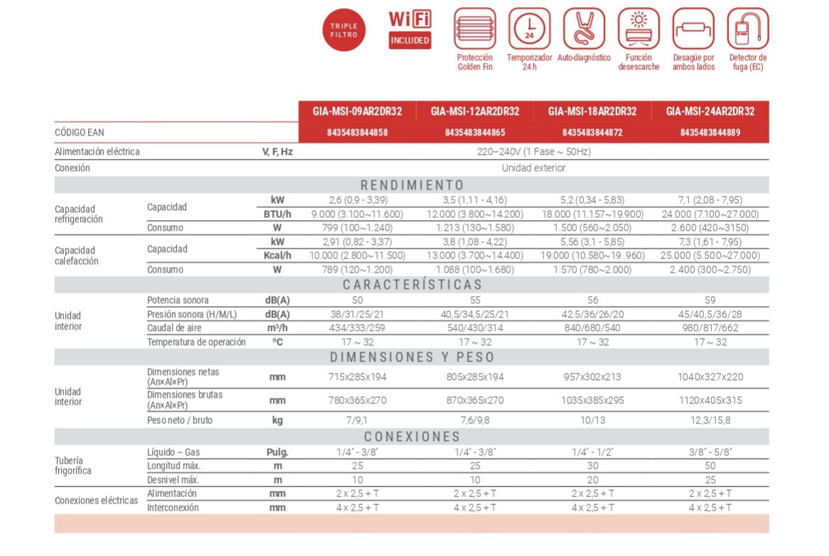UNIDAD/ES INTERIOR: GIA-MSI-09AR2ER32 (2.236 frig/h) + GIA-MSI-12AR2ER32 (3.010 frig/h)